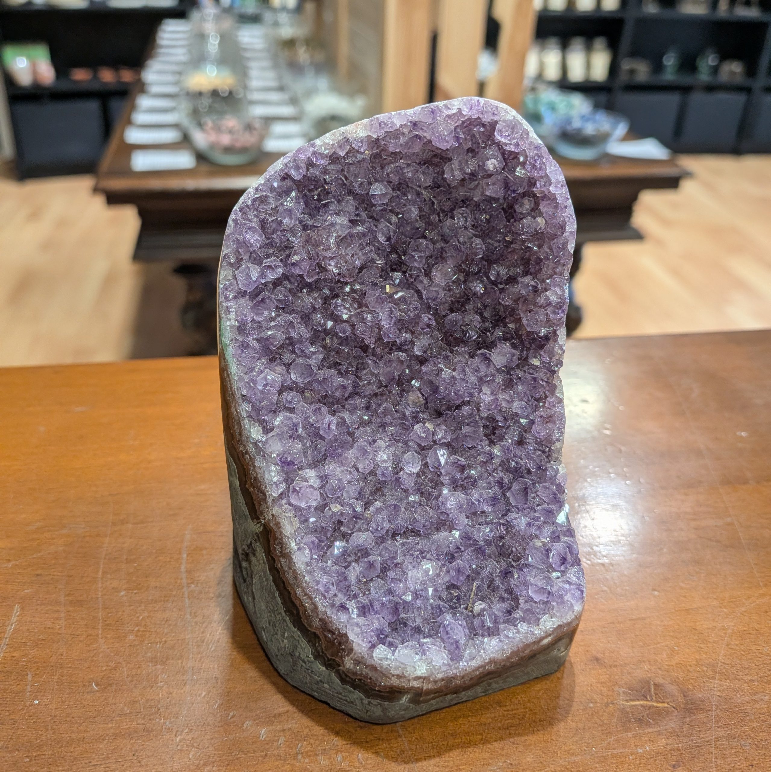 Cette géode d’améthyste est une pièce magnifique, profonde et lumineuse, remplie de cristaux violets allant du lilas au prune. Sa cavité naturelle forme un véritable nid énergétique, parfait pour apaiser un espace et favoriser la méditation.