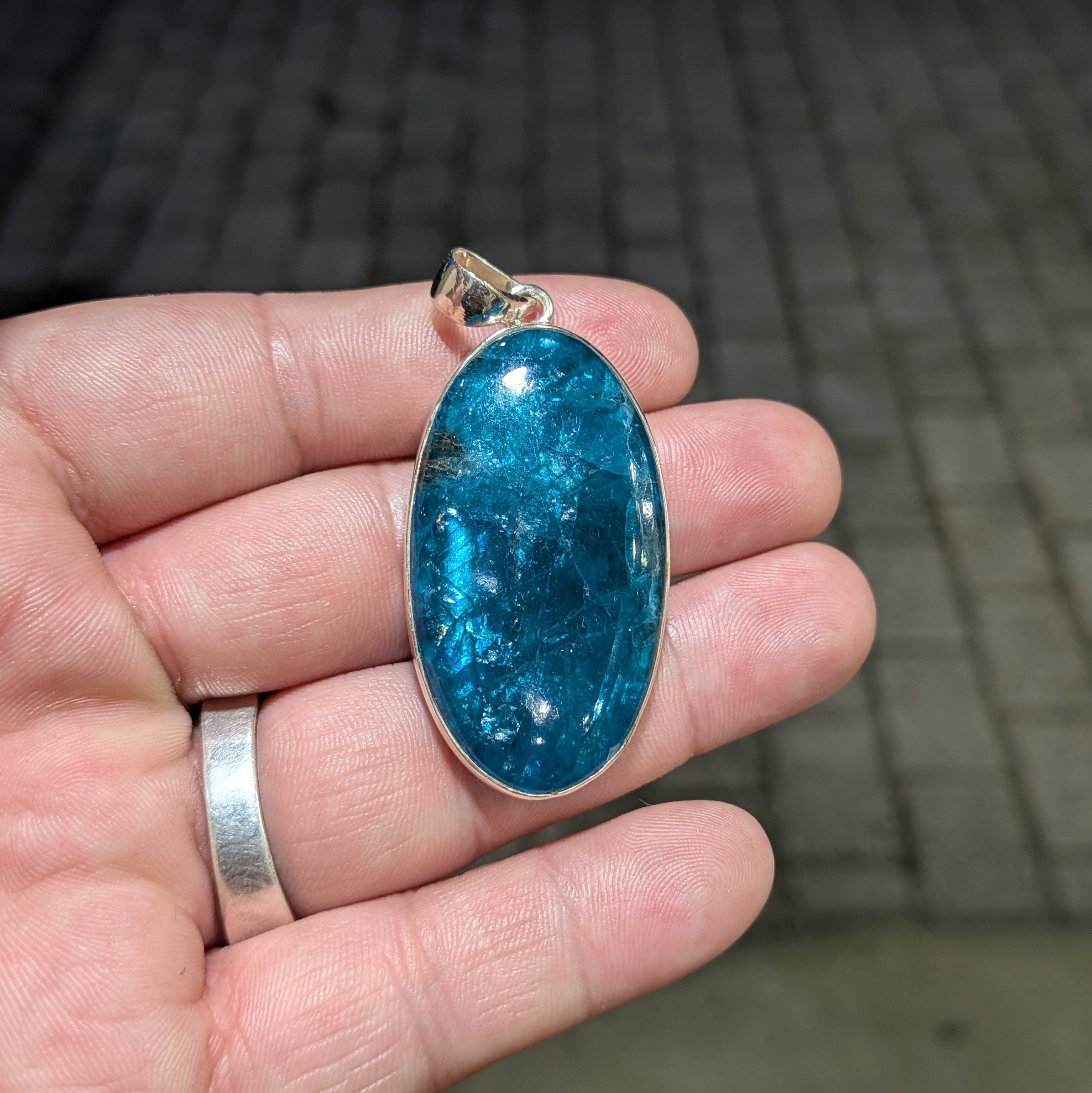 Montée sur argent 925, cette pièce assume un positionnement haut de gamme, autant pour la beauté brute de la pierre que pour son impact visuel une fois portée. L’apatite bleue est souvent associée à la clarté mentale, à l’expression et à l’inspiration, mais ici, c’est avant tout la qualité joaillière de la pierre qui prime : une apatite de caractère, rare à ce niveau de rendu.