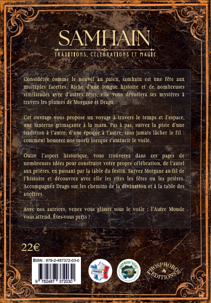 Outre l’aspect historique, vous trouverez dans ces pages de nombreuses idées pour construire votre propre célébration, de l’autel aux prières, en passant par la table du festin. Suivez Morgane au fil de l’histoire et découvrez avec elle les rites les fêtes ou les prières. Accompagnez Drago sur les chemins de la divination et à la table des ancêtres. Avec nos autrices, venez vous glisser sous le voile : l’Autre Monde vous attend. Êtes-vous prêts ?